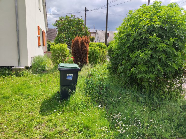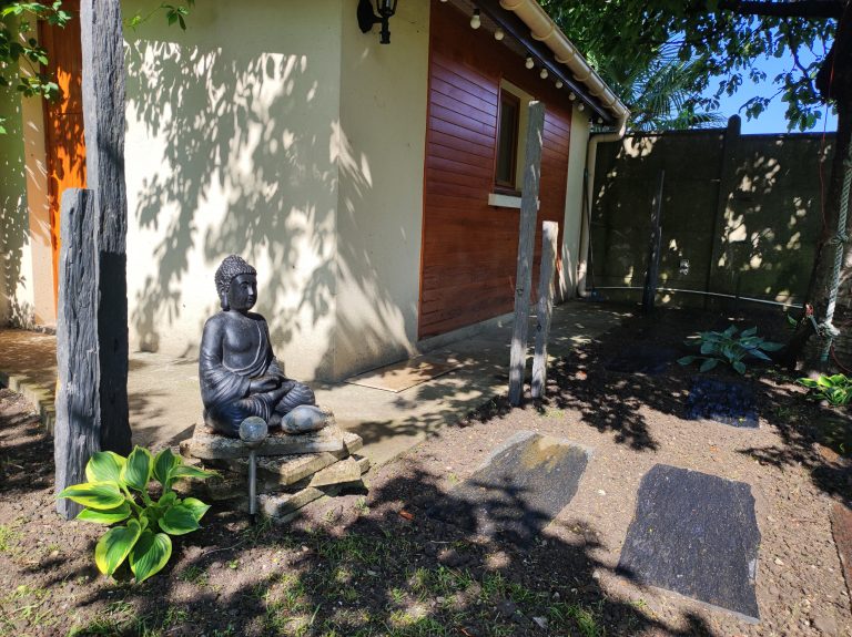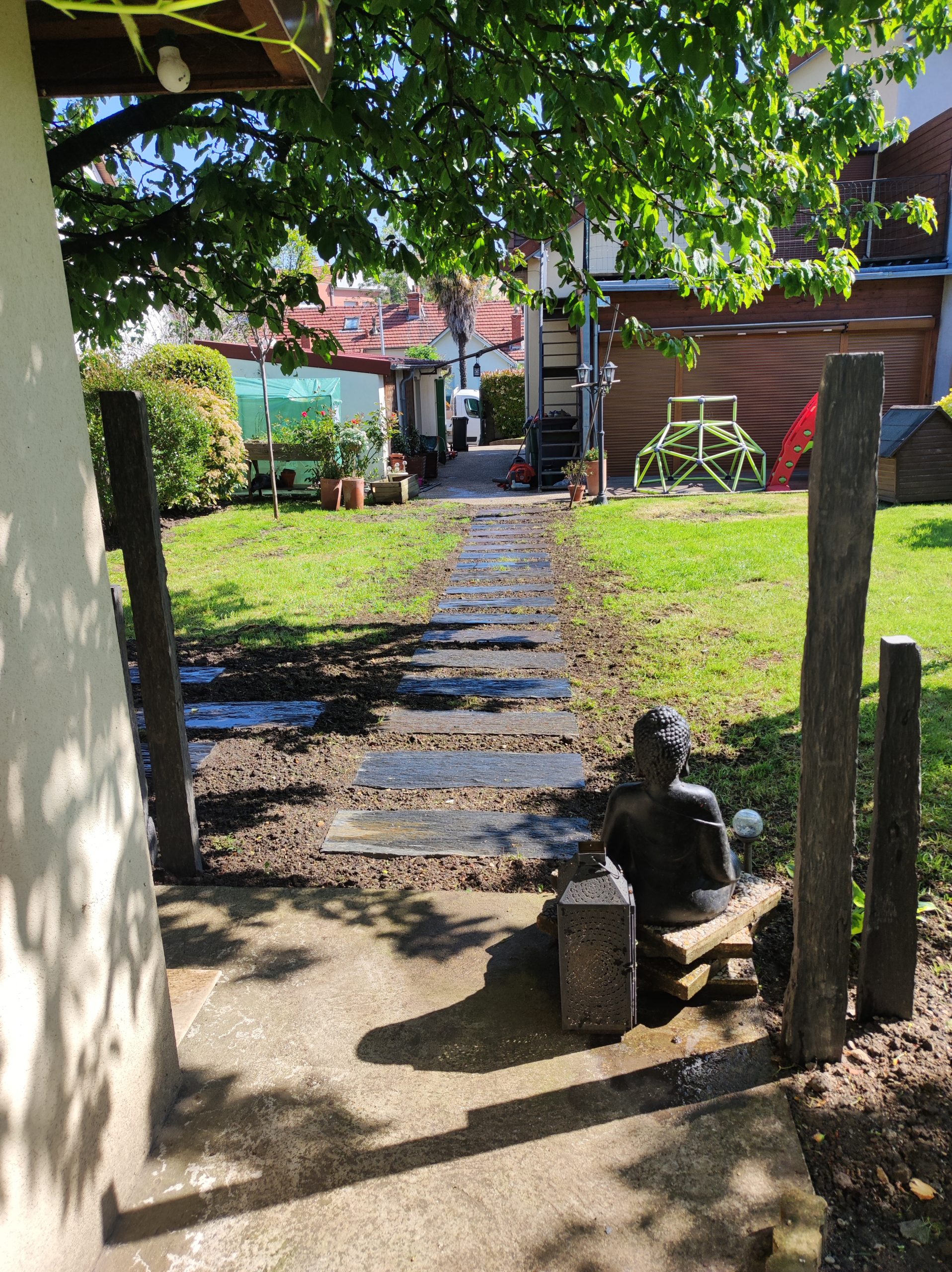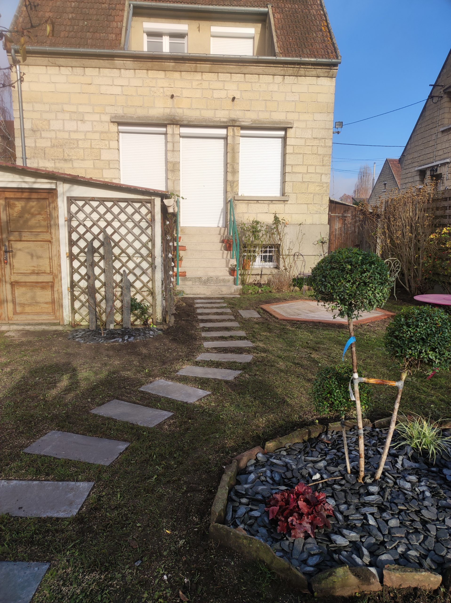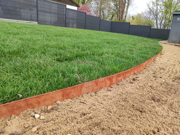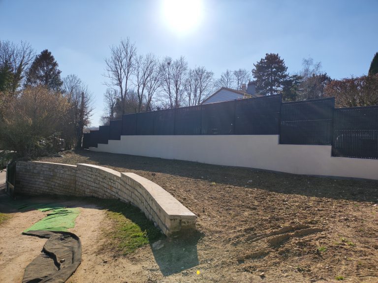 Aménagement d’un espace vert : création d’un banc sur mesure, implantation de pas japonais, bordures en schiste maçonnées avec espace de plantation et de rocaille, pose de pelouse en semi, décorations paysagères et création d’un espace pour les poubelles.