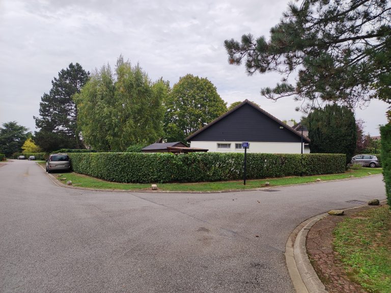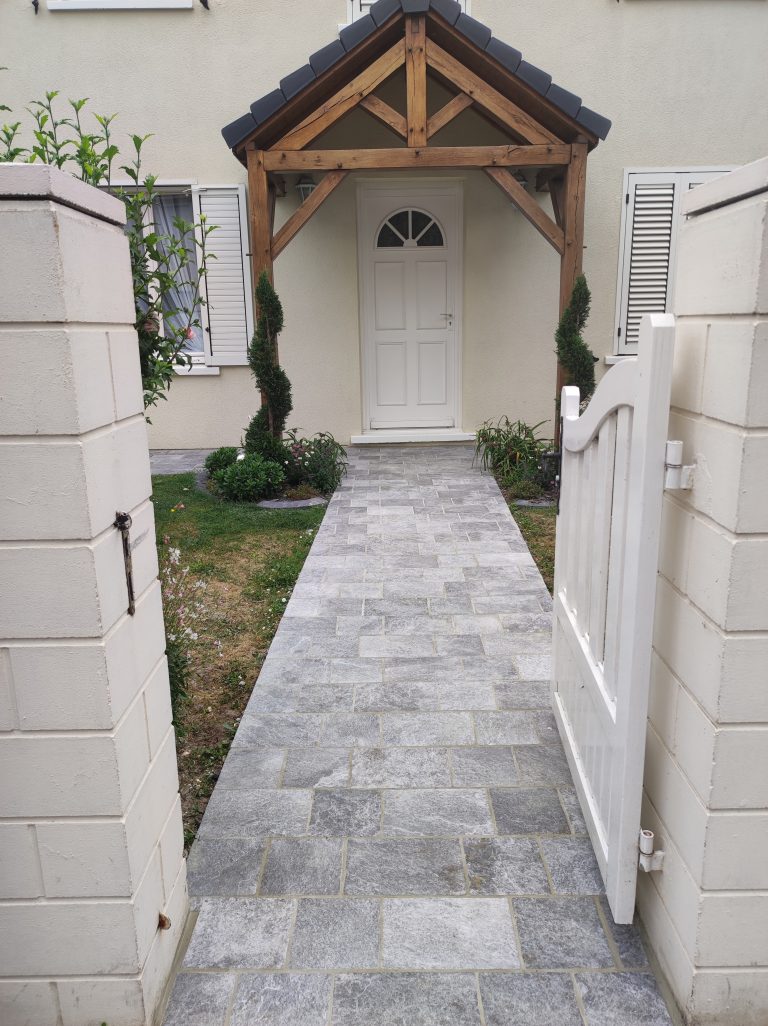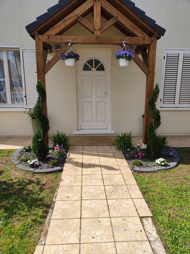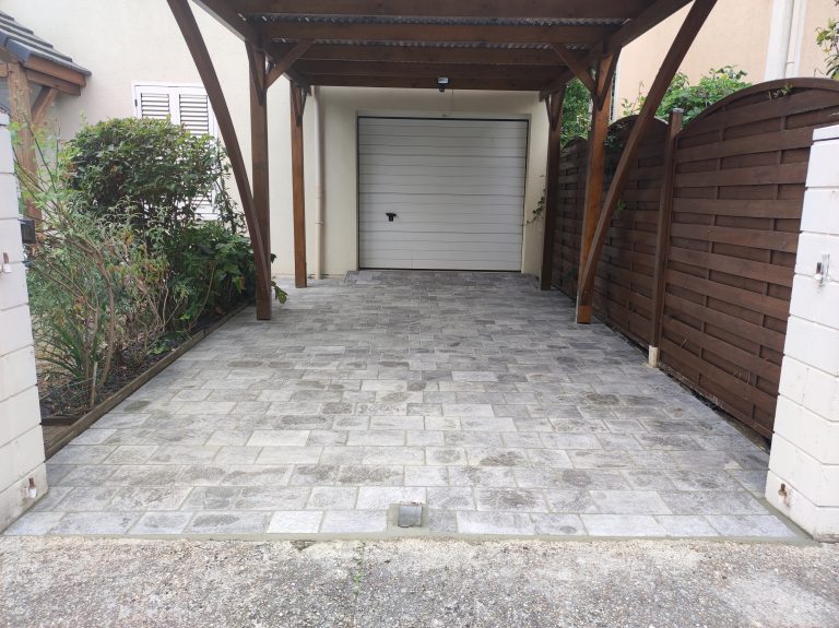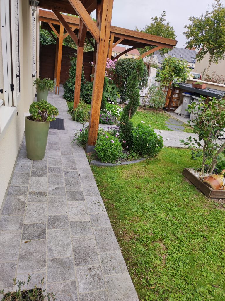 Création d’une allée de garage en pavés, mise en place de bordures, plantations diverses.